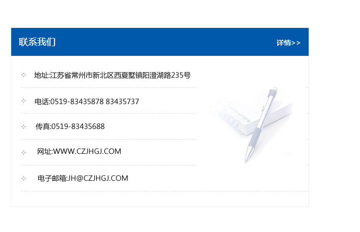 地址:常州市新北區友邦商務大廈1幢16、17層  電話:0519-85101652  傳真:0519-85112595  郵編:213022  網址:www.cz-jiayue_cn.bdtaoci.com  郵箱:xiajifengaa@163.com